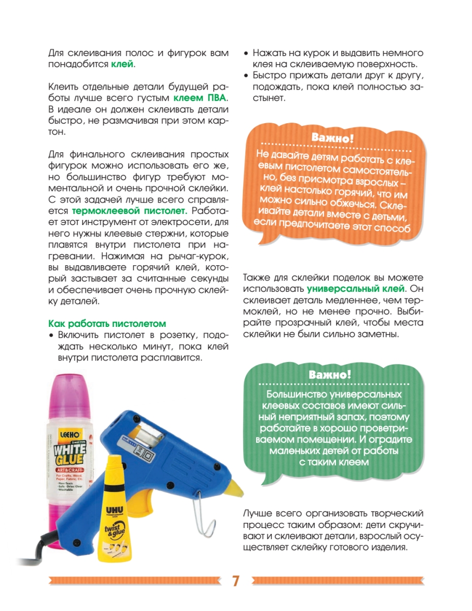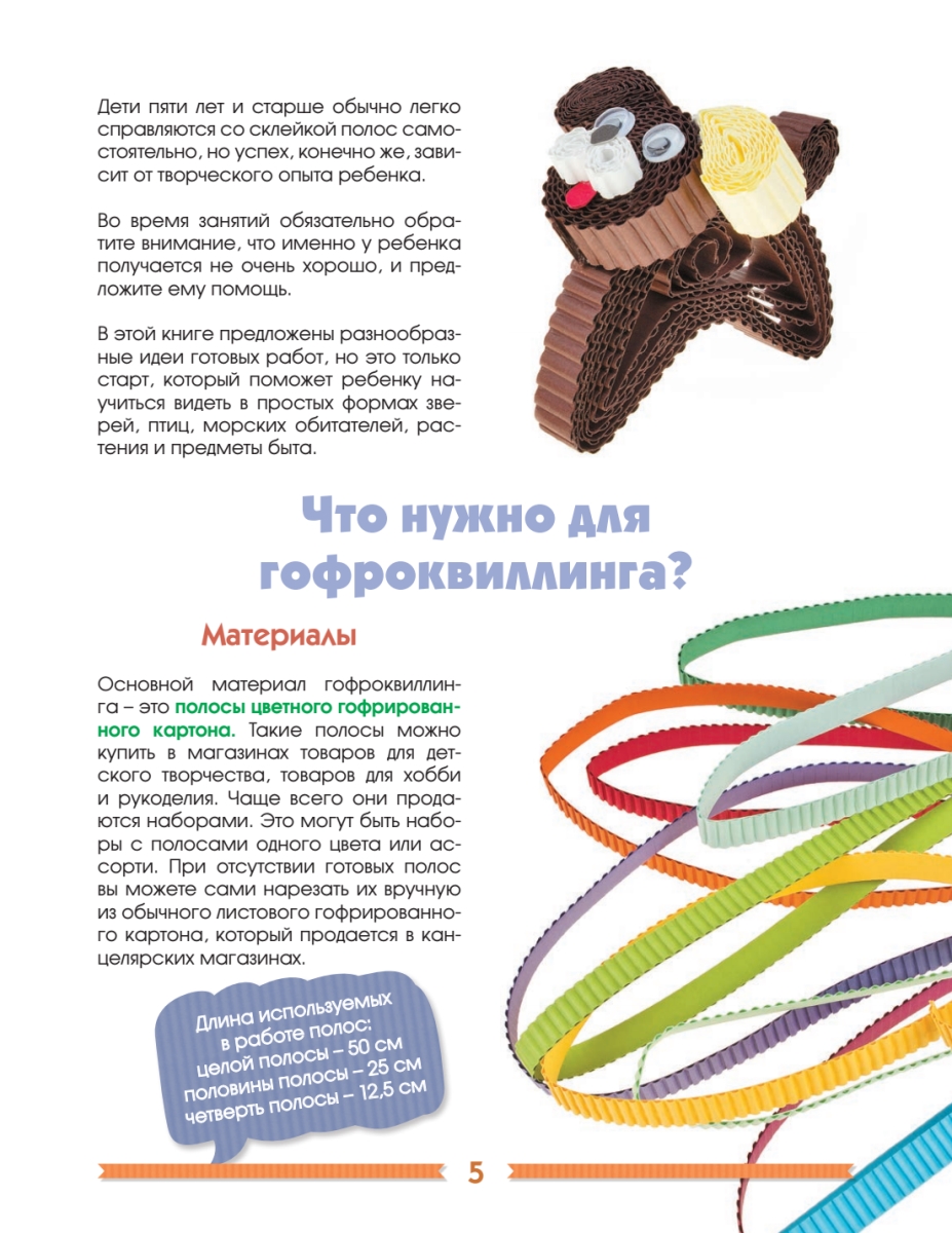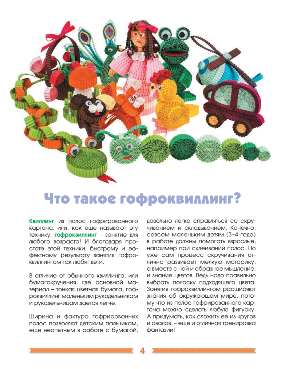 Автор рассказывает и показывает как ребенок 3-10 лет может сделать удивительные объемные фигурки из гофрированного картона своими руками, с помощью родителей или самостоятельно. Гофроквиллинг - набирающая популярность техника работы с оригинальным материалом – цветными полосками картона - особенно понравится самым маленьким читателям. Они плотные и упругие, фигурки из них получаются объемные, красивые, а времени на изготовление тратится немного: всего полчаса усилий - и в руках у малыша готовая игрушка. Работа с этим материалом развивает мелкую моторику, творческое мышление и учит основам конструирования. Освоив простейшие приемы на представленных в книге примерах, пройдя представленные автором пошаговые мастер-классы, дети смогут придумывать свои интересные фигурки.