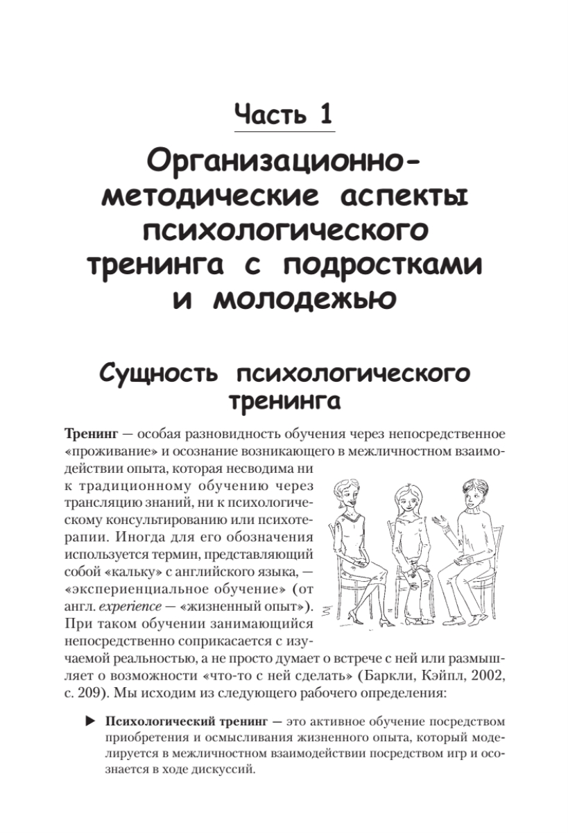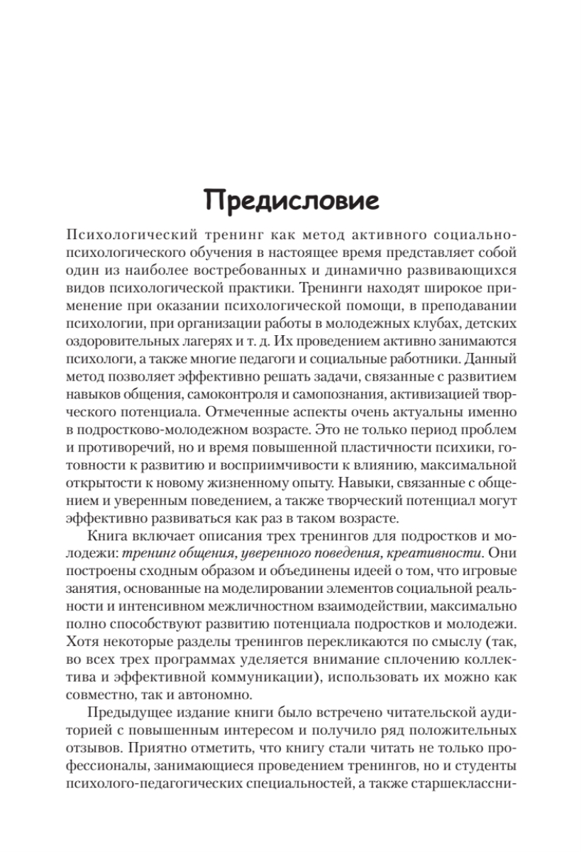 Как научить подростка общительности, уверенности в себе? Как развить его познавательные и творческие способности? Как помочь понять самого себя? Вам помогут психологические тренинги! Тренинг — один из наиболее востребованных видов психологической работы с молодежью, позволяющий формировать социальные навыки, создавать условия для личностного и интеллектуального развития. В книге приводятся подробные описания трех программ тренингов, а также рассматриваются важнейшие организационные вопросы, возникающие при их реализации. Материалы позволят эффективно проводить тренинги различной направленности со школьниками и студентами. Издание адресовано психологам-практикам, педагогам и другим специалистам, работающим с молодежью, а также студентам психолого-педагогических специальностей.