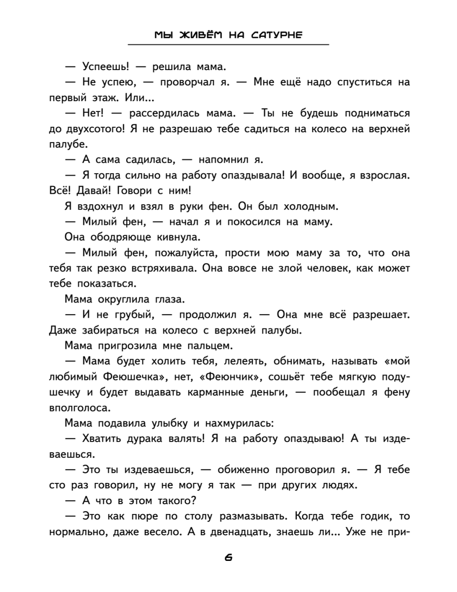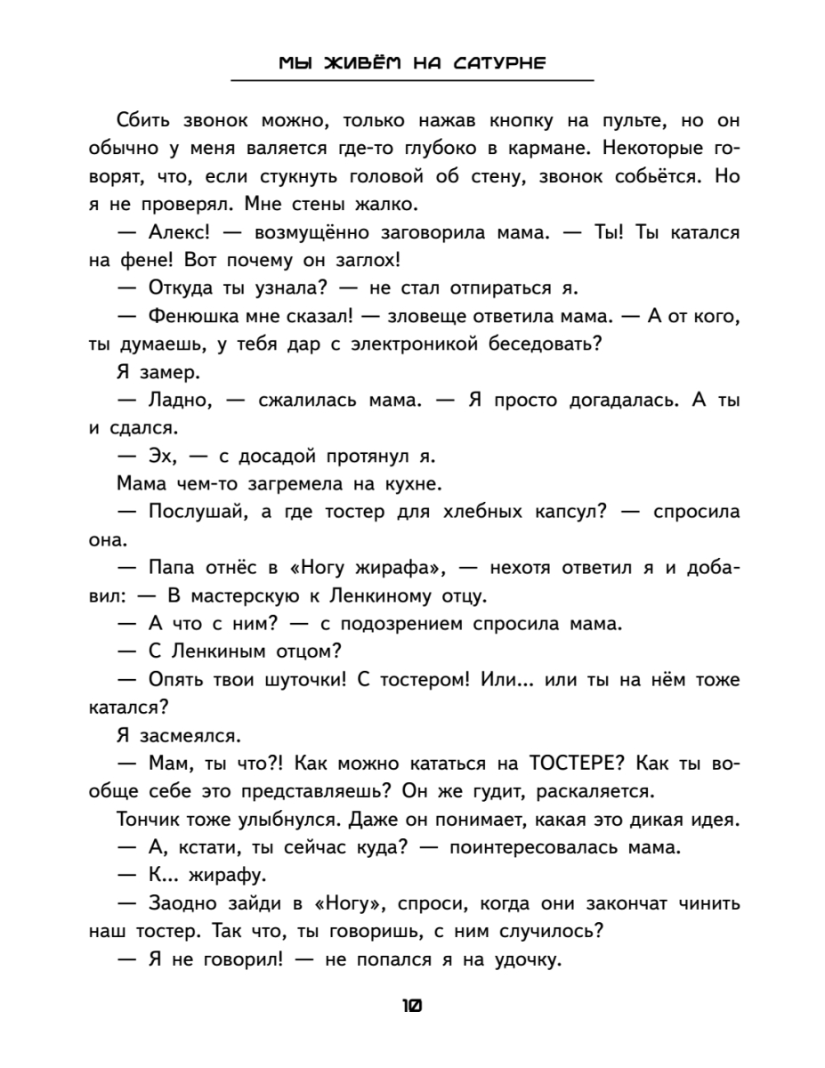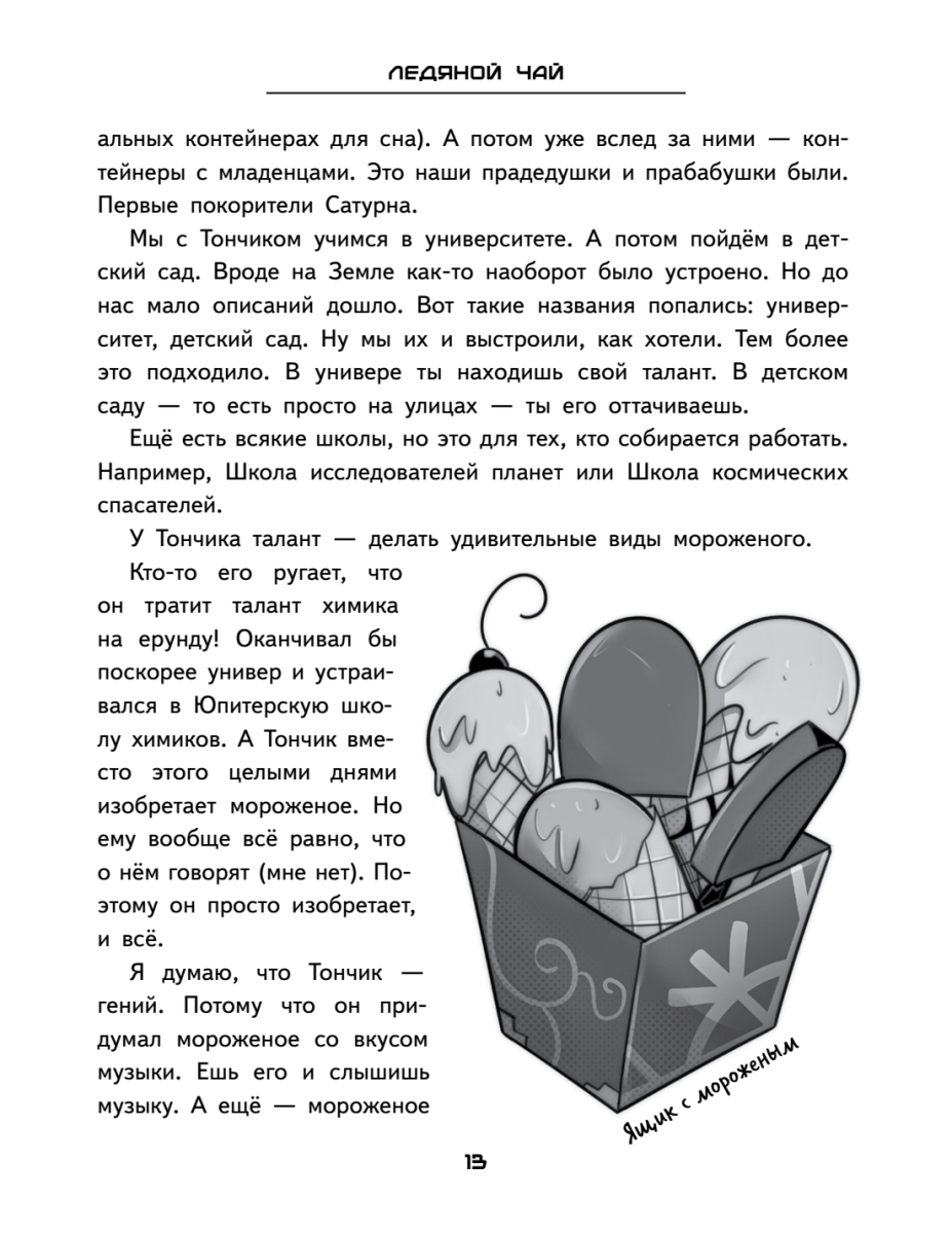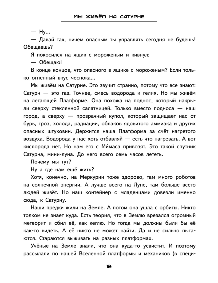 Доброе пожаловать на Сатурн! Только не угоняй космошип и не пытайся переспорить варна.Много лет назад Земля ушла с орбиты, и люди переселились на другие планеты. Алекс родился на Сатурне. Тут у каждого ребёнка свой талант. Сашка выращивает удивительные растения. Тончик – искусный химик, изобрёл десятки сортов мороженого. Ленка – умелая механичка, вместе с отцом строит космические корабли. Но в чём талант Алекса? Пока он ищет себя, ему предстоит спасти сестру от космического разбойника, подружиться с варном, сразиться в космогонке и попробовать перевоспитать главного хулигана Сатурна.Две истории в одной книге: о дружбе, которая крепче любого суперклея, и о том, что даже полный провал может закончиться чашкой ароматного чая.