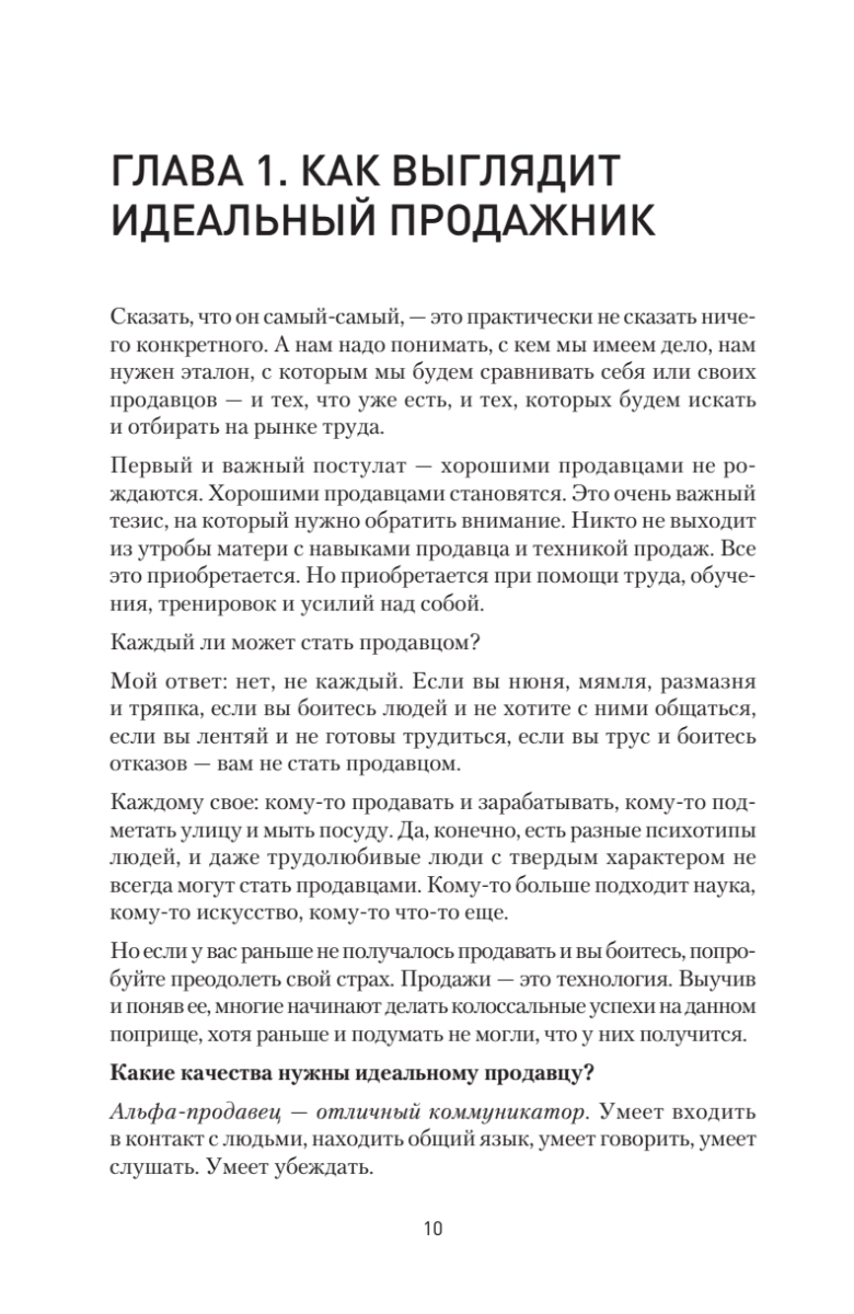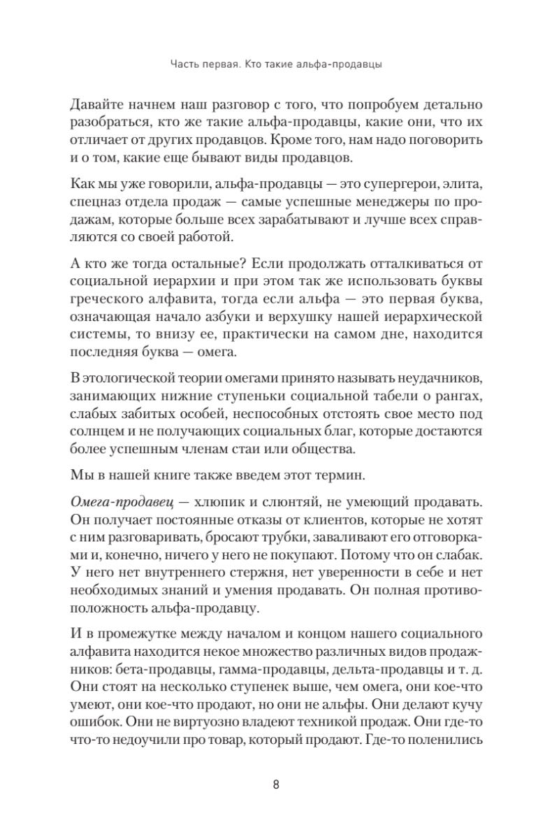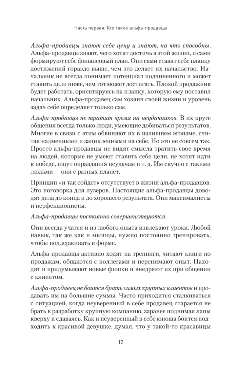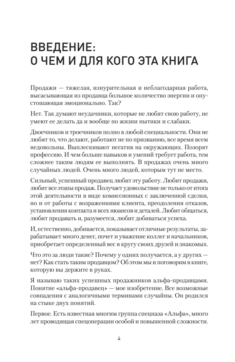В продажах много случайных людей. Сильный, успешный продавец любит свою работу и получает удовольствие не только от комиссионных с заключенной сделки, но и от общения с клиентами, преодоления отказов, установления контакта, всех нюансов и деталей. Таких успешных менеджеров автор называет альфа-продавцами. Из книги вы узнаете, как сформировать команду чемпионов в отделе продаж, каким должен быть суперпродавец, как его отобрать, научить и как им управлять. Автор подробно описывает основные навыки, необходимые для работы альфа-продавцов, а также дает практичные советы о том, как выстраивать продажи при помощи такого спецназа. Представленный в книге опыт позволит вам избежать самых распространенных ошибок, которые так злят нас в продавцах, когда мы сами бываем в роли клиентов.Издание адресовано как начинающим менеджерам по продажам, так и опытным продавцам — улучшайте свои результаты, станьте первым, настоящим альфа-продавцом. Книга также будет полезна руководителям отделов продаж, топ-менеджерам и владельцам бизнеса — будьте альфа-начальником, применяйте на практике инструменты для выращивания альфа-продавцов.