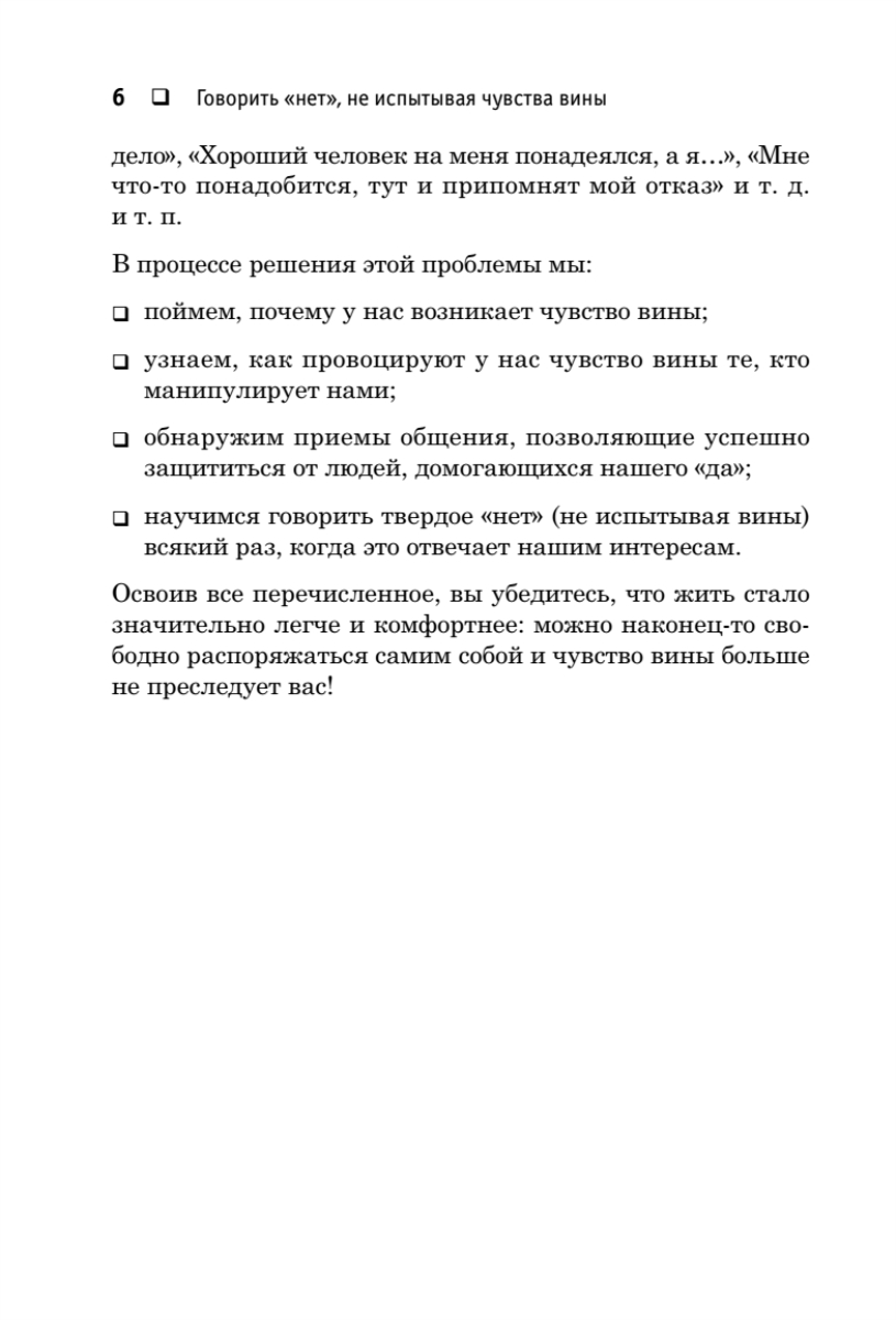 Вроде бы простое слово — «нет», но как порой бывает трудно его произнести! И все же научиться говорить его — уверенно, спокойно и дружелюбно — вполне возможно. Почувствуйте власть, которую дает вам слово «нет». Оно может избавить вас от обеда, на который вы действительно не хотите идти. Оно может оградить вас от людей, тратящих ваше драгоценное время на пустую болтовню. Оно может дать четко понять, что пора перестать сидеть у вас на шее. Наконец, оно может сэкономить ваши деньги.Слово «нет» — незаменимый инструмент, который сохраняет ваше время и силы на то, что действительно важно. Научитесь произносить это слово, не испытывая чувства вины.
