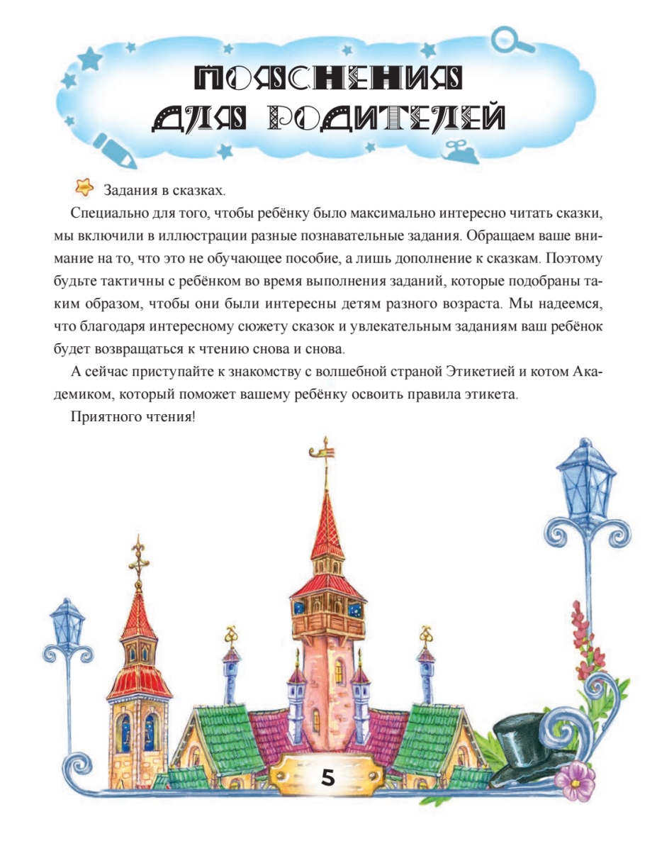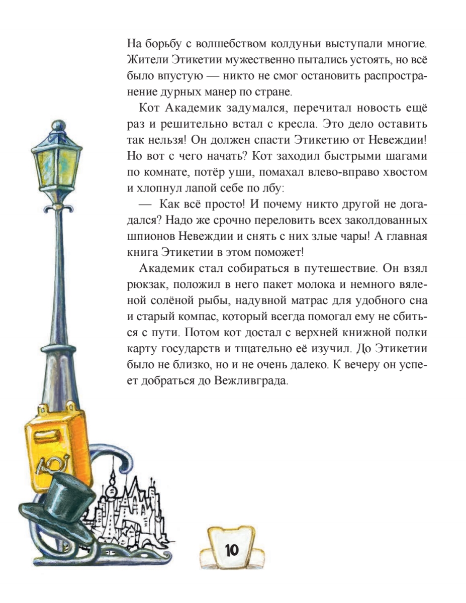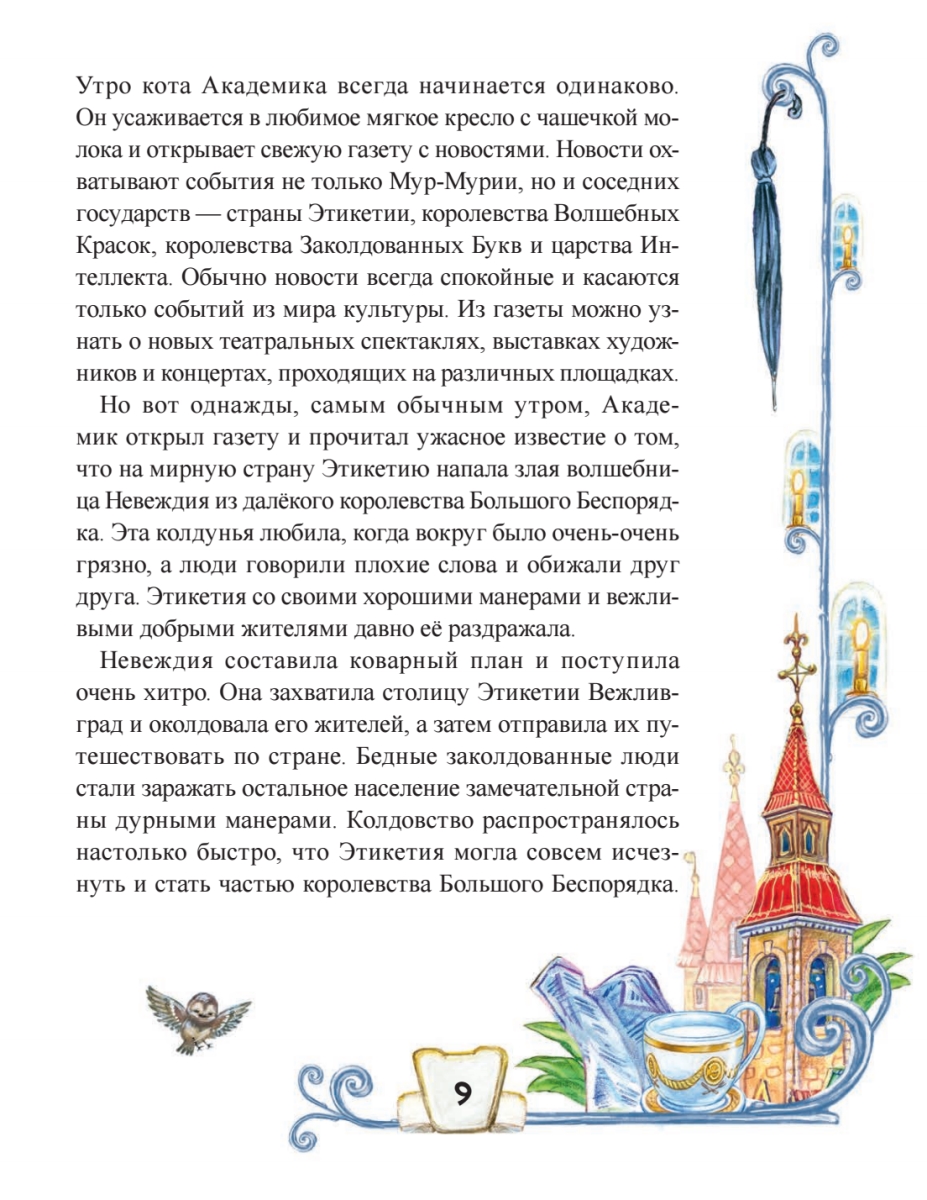 Это не обычная книга, а самый настоящий детектив для детей! Казалось бы, просто сказка и интересные задания к ней. Но, читая её ребенку, вы обнаружите бесценные сокровища: в сюжет так легко и ненавязчиво вплетены правила этикета и поведения в обществе, что их невозможно не понять и не запомнить!Главный персонаж книги, кот Академик, всегда готов прийти на помощь! Вот и сейчас он отправляется в страну Этикетию, чтобы победить злую колдунью Невеждию.Маленький читатель почувствует себя настоящим сыщиком, выручая Академика и выслеживая вместе с ним шпионов Невеждии. А вы поможете малышу усвоить и соблюдать простые, но такие необходимые правила этикета. Как? Когда ребенок плохо себя ведёт, спросите, не заколдовала ли его злая колдунья Невеждия? Увидите, что получится.Приключения кота Академика входят в цикл уже знакомых читателям и полюбившихся детям «Сказок для Умнички». Эти удивительные книги и развлекают, и учат, и развивают, и рассказывают о странах и континентах, этикете, о самых простых законах физики и химии, о творчестве, алфавите и о многом другом.Авторы книг — профессиональные педагоги и психолог, создатели множества развивающих программ для малышей.