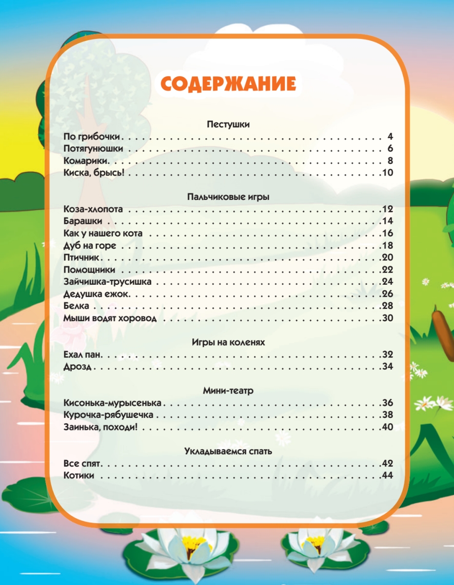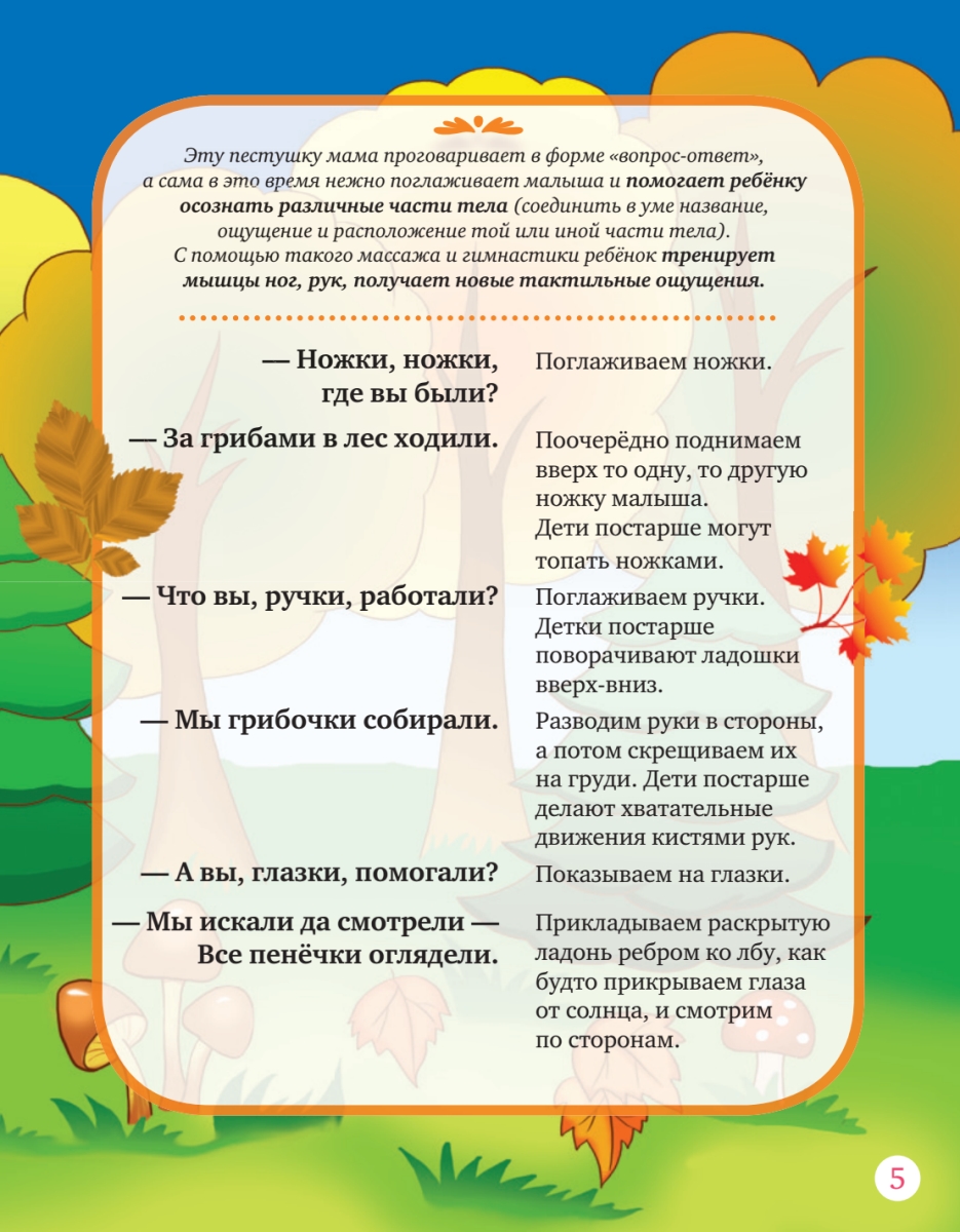 В книгу входят потешки и пестушки, которые можно использовать в качестве пальчиковых игр, игр на коленях, для создания театрального мини-представления и при укладывании ребёнка спать. Потешки ярко иллюстрированы. По нотам вы можете сыграть песенки и спеть их своему малышу. По этой книге легко и весело заниматься, развивать речь ребёнка, его крупную, мелкую моторику и чувство ритма. Рассматривание ярких картинок станет любимым занятием вашего малыша. Книга известного детского психолога Елены Бурак создана по авторским методикам раннего развития ребенка и может быть рекомендована для занятий с детьми самого раннего возраста.