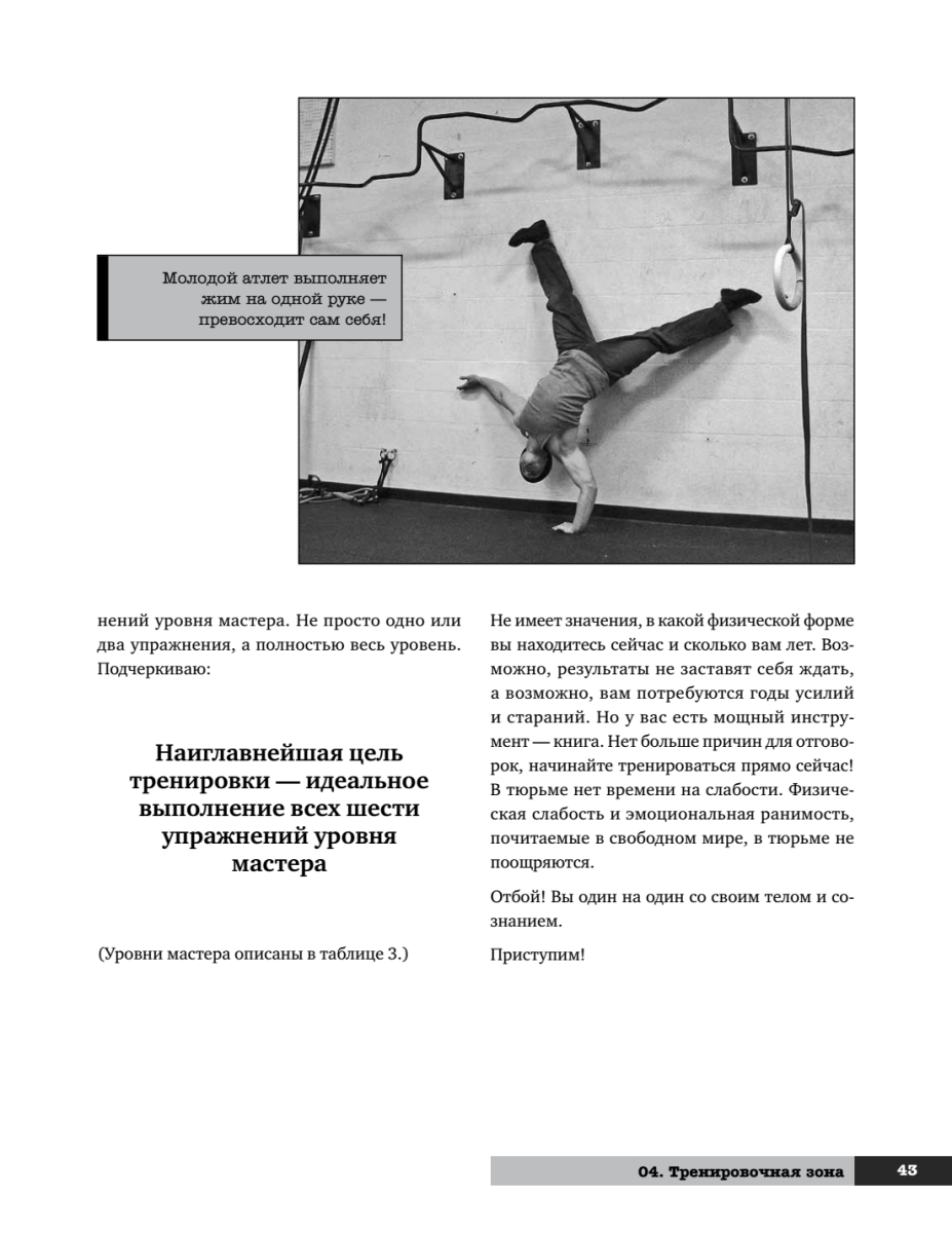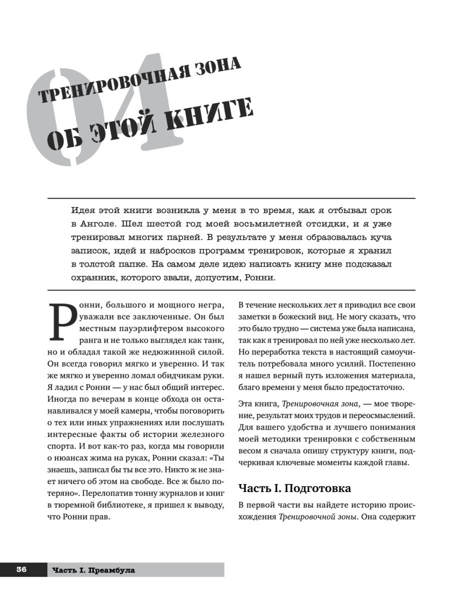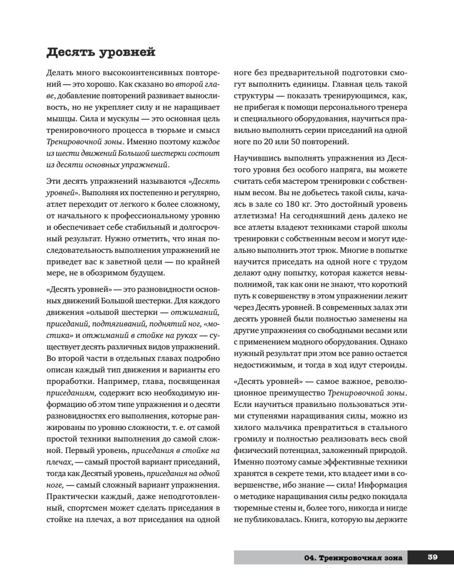 Эта книга — квинтэссенция знания о физической культуре, методах тренировок, здоровье и красоте. С одной стороны, она повествует об истории возникновения методов развития силы человека и их значении, а с другой — представляет собой полноценную поэтапную систему развития физических способностей, с детальным описанием упражнений и графиками выполнения.О чем эта книга? О свободе. О выживании. О человечности. Она написана бывшим заключенным, человеком, лишившимся свободы на более чем двадцать лет. Человеком, который побывал в жерновах самых суровых тюрем Америки. Человеком, вынужденным обратиться к силе, чтобы выжить. Человеком, лишенным всего, кроме своего тела и души, — и решившим несмотря ни на что развиваться и обрести свою личную свободу, которую никто не мог у него отнять. Свободу сильного тела и крепкого духа.