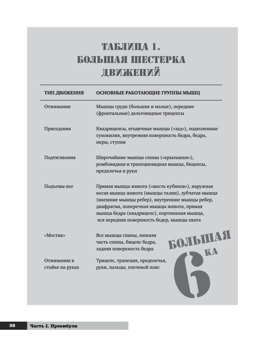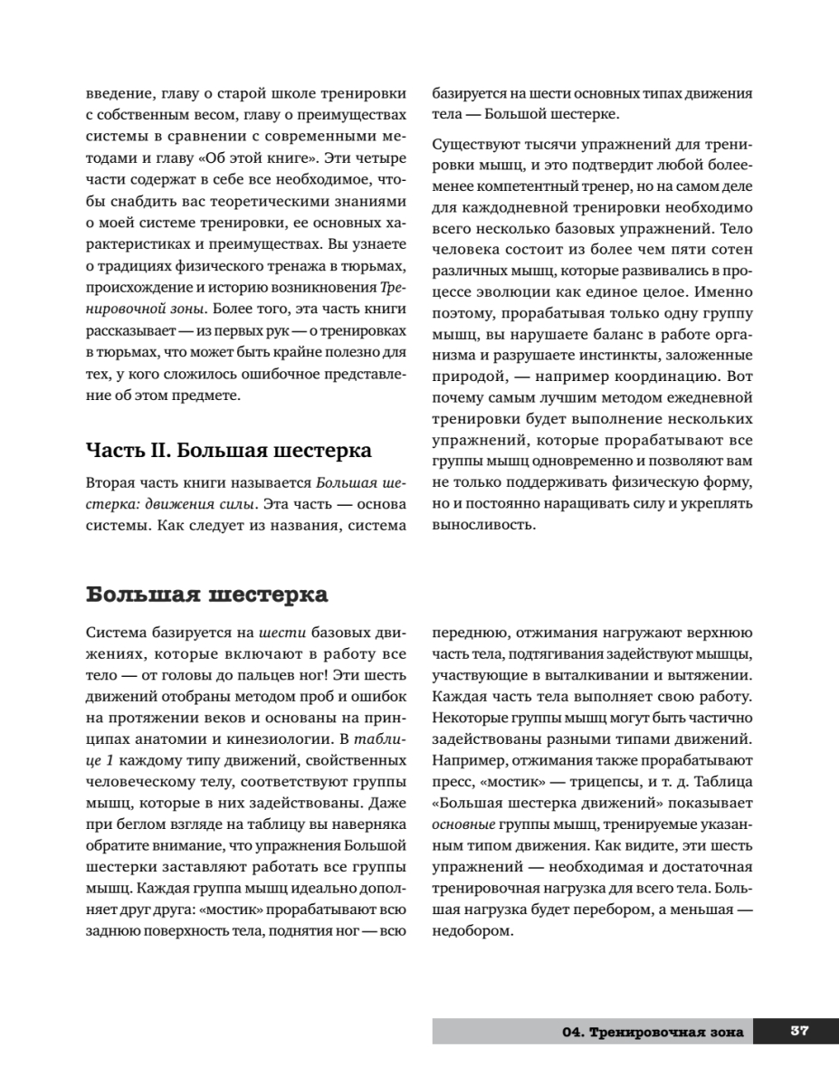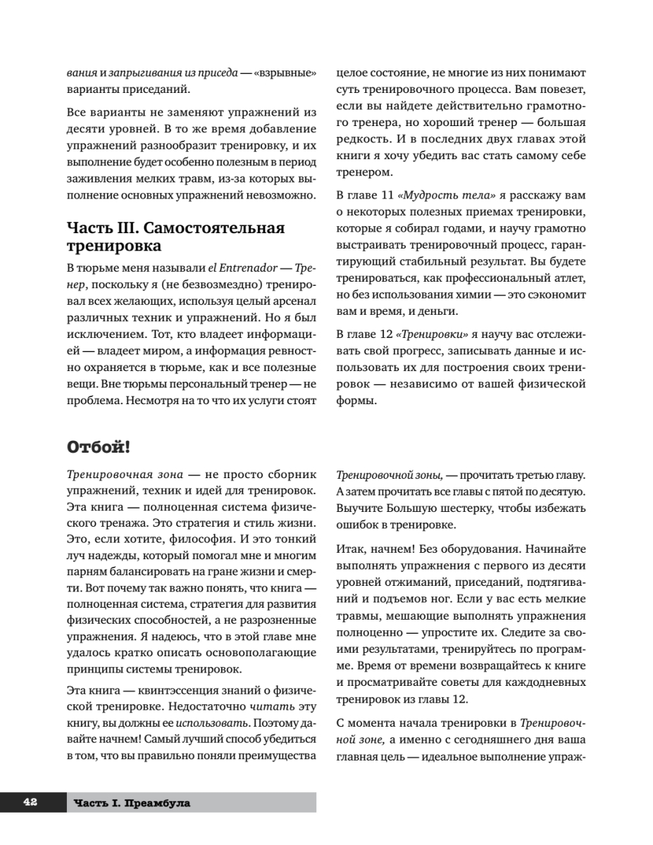 Эта книга — квинтэссенция знания о физической культуре, методах тренировок, здоровье и красоте. С одной стороны, она повествует об истории возникновения методов развития силы человека и их значении, а с другой — представляет собой полноценную поэтапную систему развития физических способностей, с детальным описанием упражнений и графиками выполнения.О чем эта книга? О свободе. О выживании. О человечности. Она написана бывшим заключенным, человеком, лишившимся свободы на более чем двадцать лет. Человеком, который побывал в жерновах самых суровых тюрем Америки. Человеком, вынужденным обратиться к силе, чтобы выжить. Человеком, лишенным всего, кроме своего тела и души, — и решившим несмотря ни на что развиваться и обрести свою личную свободу, которую никто не мог у него отнять. Свободу сильного тела и крепкого духа.