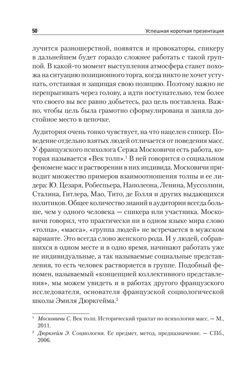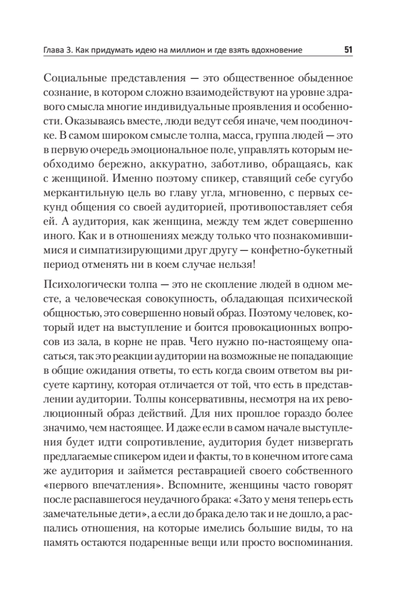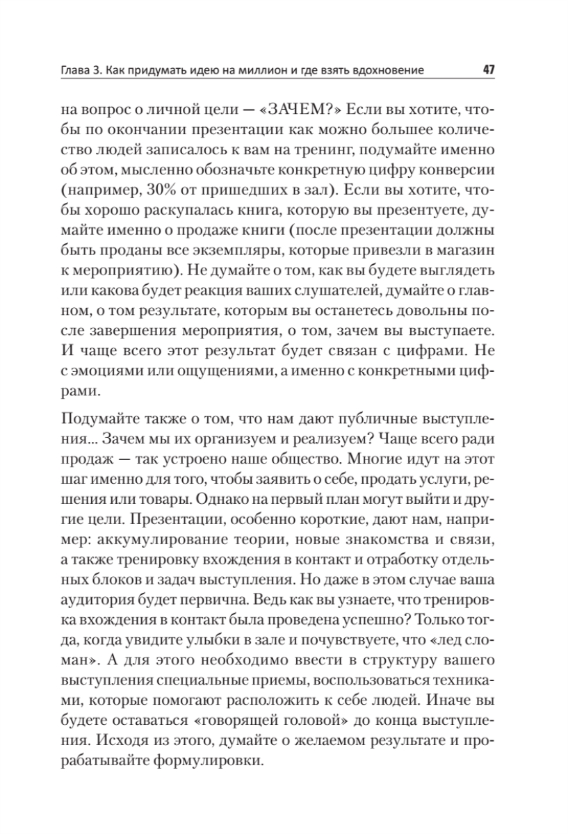 Представителям многих профессий, чтобы стать заметнее и успешнее, приходится предпринимать шаги в сторону публичности. Для многих бизнес-тренеров, психологов, консультантов уже стало нормой перед проведением тренинга или иного обучающего мероприятия проводить короткие, от 1 до 2-3 часов, продающие презентации и мастер-классы. Мы находимся в начале формирования нового тренда — эпохи коротких продающих выступлений. Начните общаться с аудиторией, говоря просто — о высоком, доступно — о сложном. Ключевое слово — общение, то есть на равных. Ораторы с гипнотическим авторитетом в мировой истории уже были, и их успех завораживает, вспомните Мартина Лютера Кинга и его речь «У меня есть мечта», Стива Джобса со словами выпускникам Стенфорда и Рэнди Пауша. В чем же секрет успеха этих спикеров? В правильной постановке цели, мощной идее, структуре и манере преподносить информацию. Они рассказывают о себе аудитории. Именно этого сейчас ждет публика, именно этого ей так не хватает. И именно за такими спикерами и их идеями она готова следовать. Эта книга посвящена тем, кому приходится делать небольшие — от 10 минут до 1,5 часов публичные выступления — это студенты и преподаватели, психологи и бизнес-тренеры, врачи и консультанты, инфобизнесмены и ведущие вебинаров, маркетологи и пиарщики, политики и руководители. Тем, кто уже читает лекции, делает так называемые «продающие» презентации, а также ведет переговоры и выступает перед аудиторией. И тем, кому это только предстоит, кто хочет быть максимально убедительным, ярким, запоминающимся и успешным.